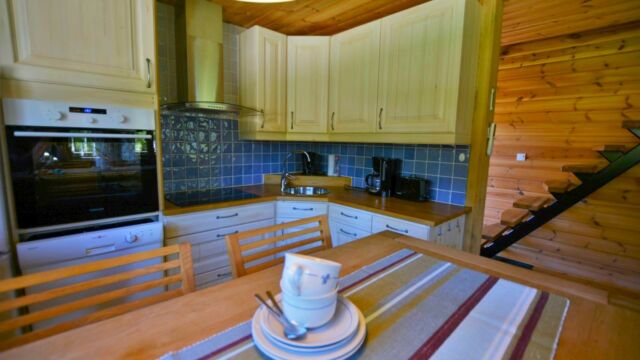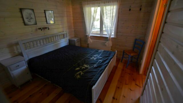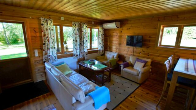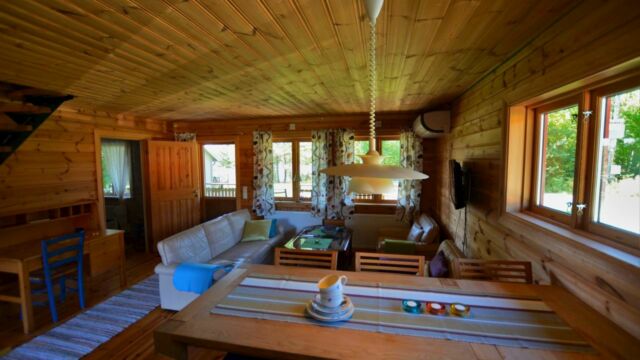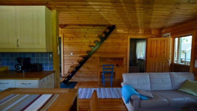 Stugan erbjuder ett mindre kök med diskmaskin, spis, micro samt kyl och frys, ett större sällskapsrum med soffgrupp och TV. I stugan finns även ett stilfullt badrum inrett med både dusch och tvättmaskin. På nedervåningen finns ett separat sovrum med dubbelsäng för två personer. På loftet erbjuds sängplatser för upp till fyra personer. Stugan har veranda på både fram- och baksidan där möjlighet finns att njuta av morgonsol likväl som kvällssol.